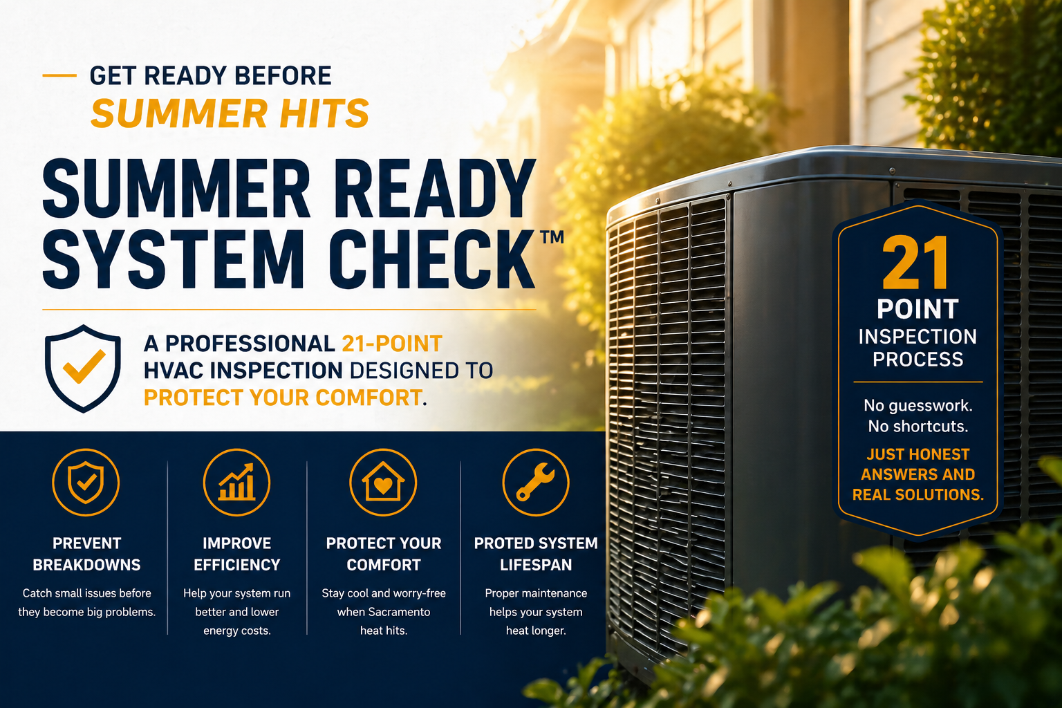 A professional 21-point HVAC inspection built to help homeowners avoid costly breakdowns during Sacramento’s hottest months.